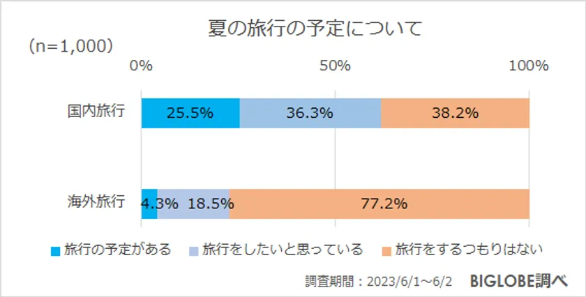 全国の20代から50代の男女1,000人に「夏の旅行の予定について」質問をすると、国内旅行については「旅行の予定がある」(25.5%)と4人に1人は既に旅行の予定があるという結果に。さらに、「旅行をしたいと思っている」(36.3%)をあわせ、6割が国内旅行への意欲があることが明らかとなった。