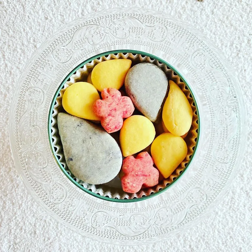 エダムチーズの風味豊かな3種類のクッキーを、彩り豊かなアジサイの花に見立て楽しんでいただけるようにつくりあげました。