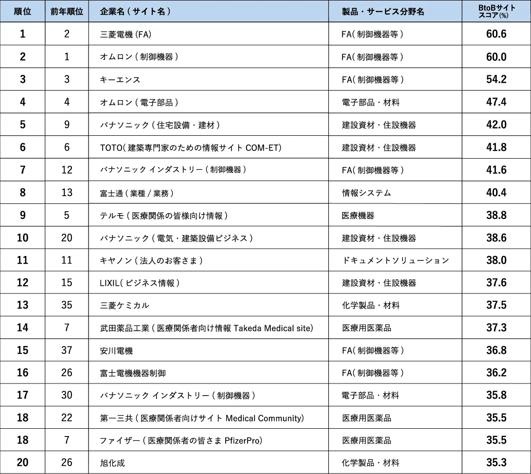 ● BtoBサイトランキング1位は三菱電機(FA)、16年連続トップのオムロン(制御機器)が2位