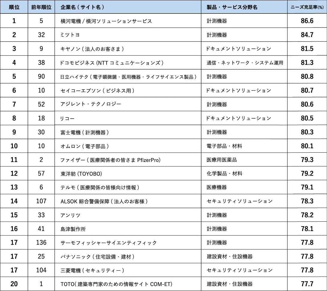 ● ニーズ充足率1位は横河電機/横河ソリューションサービス、計測機器のサイトが大幅ランクアップ