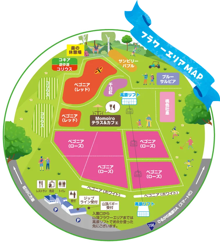 ベゴニア畑、コキアの丘、森の休憩所、キッズプレイエリア、ドックラン、Momoiroテラス&カフェ、ジップラインアドベンチャー、山頂バギー、ディスクゴルフ