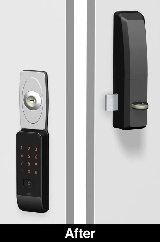 一方で「DTRS III ND」「PiACK III ND」は面付本締型を採用しており、追加工を施すことで様々な扉への取付ができ、今までスマートロックが取り付けできなかった扉に対しても電気錠化が可能になり、扉が閉まると自動で鍵が閉まる自動施錠などが実現できます。