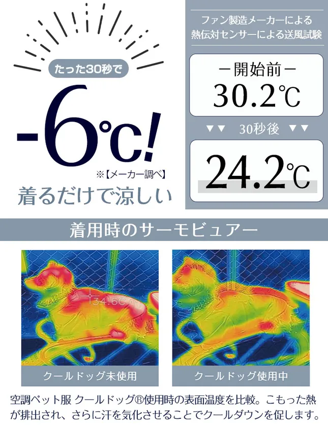 「空調ペット服 COOL DOG(R)」はペット用に開発された静音FANを専用のウェアに取り付け、FANからの風でペットの汗を蒸発させ、気化熱を利用して熱を奪い、体温を下げます。その効果は、FANの稼働後わずか30秒で表面温度が-6℃も下がるほどです。FANは安心の日本製で、超軽量80g、静音、ペットに優しい強すぎない風量、毛を巻き込みにくい構造とペットに配慮し開発されております。