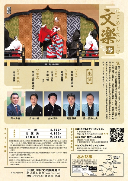 (公財)北区文化振興財団 /城北演劇を観る会主催、『はじめてたのしむ文楽 その参』が2023年8月27日 (日)に北とぴあさくらホール(東京都北区王子1-11-1)にて上演されます。チケットはカンフェティ(運営:ロングランプランニング株式会社、東京都新宿区、代表取締役:榑松 大剛)にて発売中です。