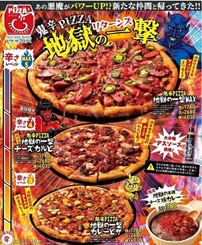 昨年世代問わず大好評だった「鬼辛PIZZA地獄の一撃」を デスソース増量の辛さMAX、旨さもアップして新登場! さらに激辛マニア悶絶の「鬼辛3品」を一挙6月28日販売開始!