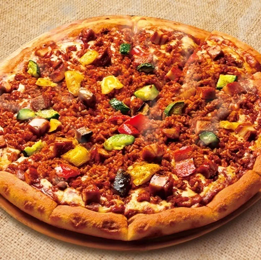 生地にデスソース&カレーソースをミックスして一面に。そしてここからが一味違います。生地の上にカレーピラフも一面に敷き詰め、粉もんon粉もん&辛味on辛味の唯一無二のピザとなります。さらにタンドリーチキン、グリル野菜、オニオンを乗せ、最後にカレーパウダーをかけ異次元の辛さへ。進化系激辛カレー味をお楽しみください。