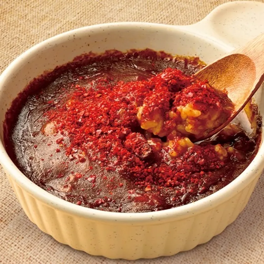 当店人気のチーズ焼カレーのカレーソースにデスソースを絶妙な配合で絡めた