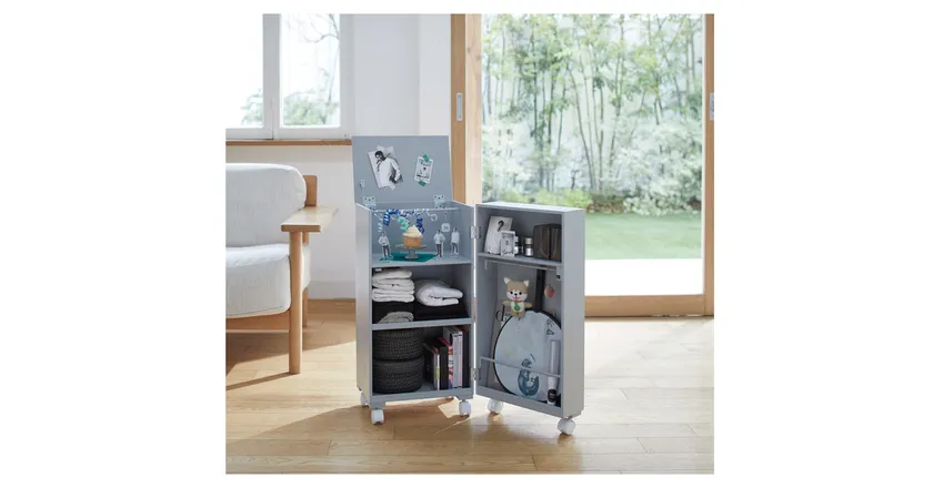 当初はライトグレーとホワイトの2色で発売。来客や家族の目に触れたくないという意見をもとに隠せる収納に。ワゴンを閉じればすっきりとコンパクトになります。キャスター付きで移動できるので、来客時に人の目を気にすることがありません。見た目は普通のワゴン、開ければ“推し祭壇”というコンセプトが人気となりました。