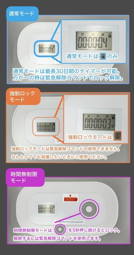 通常モード、強制ロックモード、時間無制限モードの3つのモードで、シーンに合わせて使い分けいただけます。もしもの時も安心の緊急解除コードもついています。
