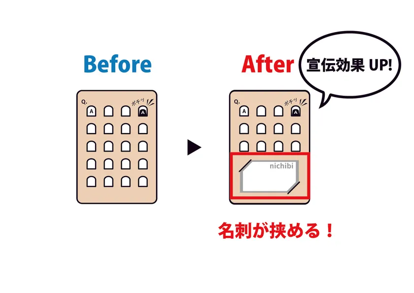 展示会やイベントでご利用いただくお客様に対して、企業や担当者の情報を簡単に提供できるよう、名刺やカードを挿入できる切り込みを新たに追加しました。これにより、単に回答を求めるだけでなく、宣伝効果の向上が期待できます。また、アンケート回答者が名刺を挿入することで、氏名記入の手間を省くことや回答者自身の情報を提供することも可能になります。この新機能により、アンケート回答者とお願いする方双方にメリットがもたらされる仕様となりました。