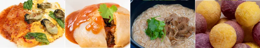 さらに、牡蠣の入ったオムレツで甘辛のタレがあう「虫可※仔煎(オアチェン)」、独特の食感と餡のしっかりとした味がクセになる「肉圓(「バーワン)」、とろとろでコクのあるスープで食べる麺料理「台湾麺線(ミエンシエン)」、芋の餡が入ったもちもち食感の「QQボール」など。