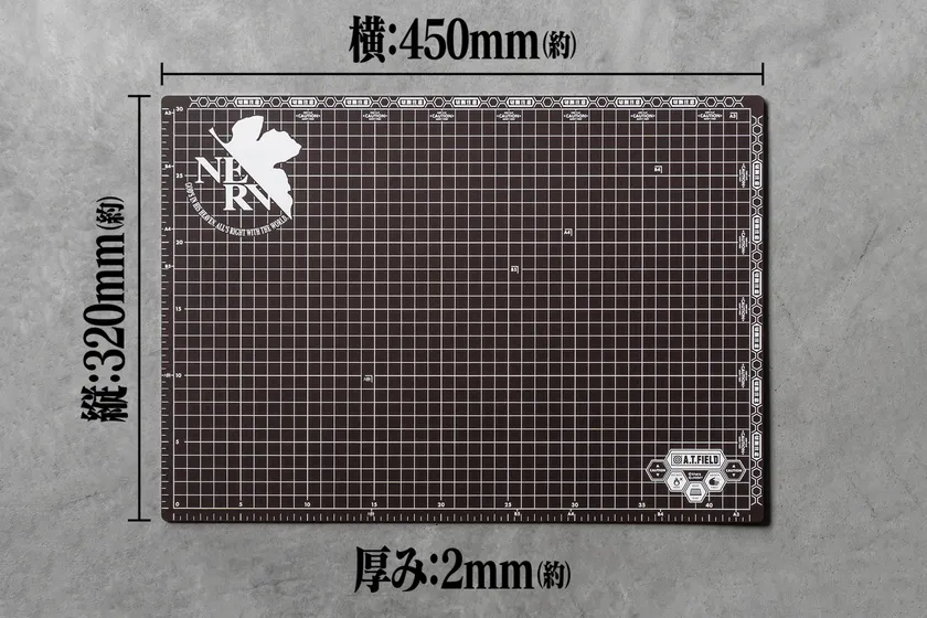 カッターは通常の物より刃先の鋭いタイプの刃を採用しており、より細かな作業が可能です。カッターマットは3層構造によるソフトな使い心地でカッティングをサポートします。エヴァンゲリオンの世界観と機能性を融合した「A.T.FIELD」らしいデザインのアイテムです。