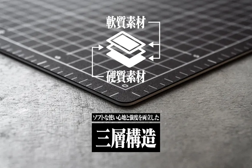 硬質素材を軟質素材ではさんだ三層構造なので表裏両面とも使えます。外側の軟質素材がソフトな刃当たりで快適なカッティングを実現。切り口が目立たず、カッターの刃の切れ味も長持ちします。また、中心の硬質素材によって強度も両立しています。