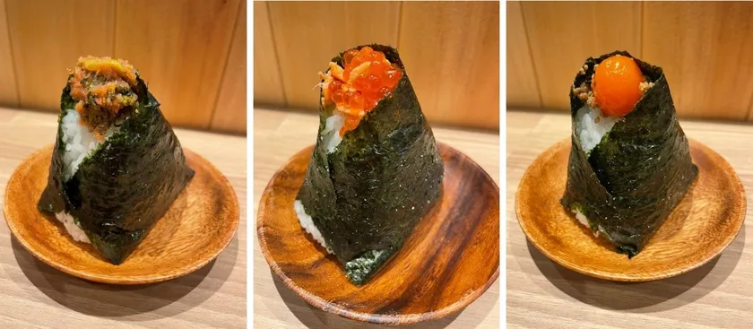 人気メニューの高菜明太子(左)、しゃけいくら(中央)、肉そぼろ卵黄(右)
