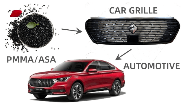 自動車用ASA・PMMAは自動車産業の外装部品製造、樹脂成形産業の射出成形加工、塗装産業の表面処理、化学産業の樹脂原料生産などで利用される。特に高級車や電気自動車の外装パネルと内装トリムで需要が集中している。