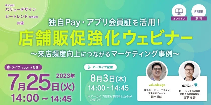 株式会社バリューデザイン(本社:東京都中央区、代表取締役社長:林 秀治)とビートレンド株式会社(本社:東京都千代田区、代表取締役社長:井上 英昭)は、2023年7月25日に、無料ウェビナー『独自Pay・アプリ会員証を活用!店舗販促強化ウェビナー ~来店頻度向上につながるマーケティング事例~』を開催します。