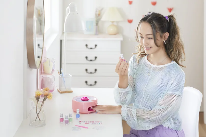 体験イベントで人気だった「MIR COLORS ライトマジックネイルドライヤー」は、ネイルポリッシュ5本とネイルドライヤーのセット。ネイルポリッシュを爪に塗り、ネイルドライヤーの中に手を入れると風が吹いて乾くようになっています。乾いた後にはネイルシールやホログラムシールでかわいくデコることができます!