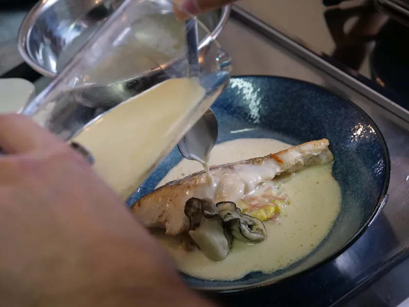 イベント内で生まれた『鱈のポワレ 牡蠣のジュとローズマリーオイルのソース』。