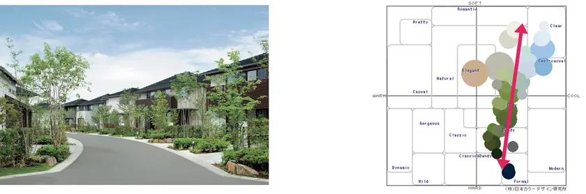 エクステリア提案においても、従来のテイスト表現から脱却し、まちなみや緑との調和を重視した提案に変革します。日本の美しい景観に共通する色の法則「明度グラデーション」を分析し、日本カラーデザイン研究所との共同研究によって最適な色を特定、オリジナル外壁色のラインナップへ反映することで、一棟の建物としても、建ち並ぶまちなみとしても上品で優しいグラデーションを実現し、美しい住宅ストックを形成。愛着を生む住まいと街づくりを実現します。