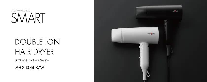 パリ発のモードヘアブランドmod’s hair(モッズ・ヘア)のスタイリングツールを展開する株式会社三栄コーポレーション(本社:東京都台東区、代表取締役社長:水越 雅己)は、「mod’s hair ADVANCED SMART(モッズ・ヘア アドバンススマート)」シリーズより、大風量2.3m3/立方メートル/分(※)の力強い風とクイックドライノズルでより素早い乾き、6通りの選べる温度と風量で、地肌もいたわりながら乾かすことができる「ダブルイオンヘアードライヤー(MHD-1246-K/W)」を公式オンラインストアにて2023年6月23日(金)より先行発売、全国の家電量販店・バラエティショップは、7月3日(月)より順次発売いたします。