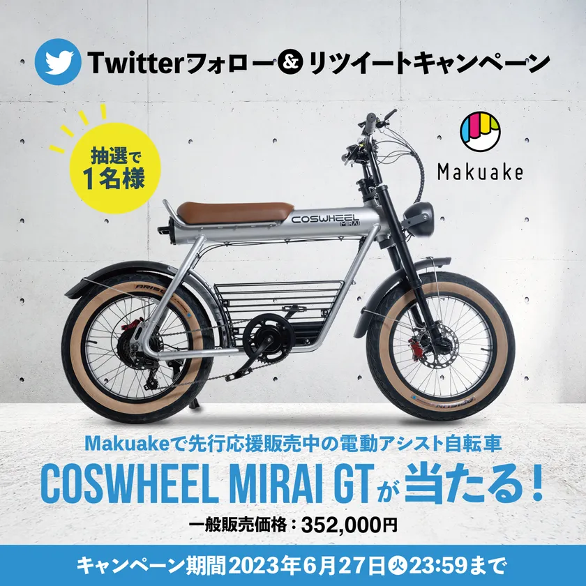 Makuake応援購入総額5,000万円を記念いたしまして、抽選で1名様に電動アシスト自転車「COSWHEEL MIRAI GT プラチナシルバー」が当たる、Twitterフォロー&リツイートキャンペーンを6月27日まで開催いたします。