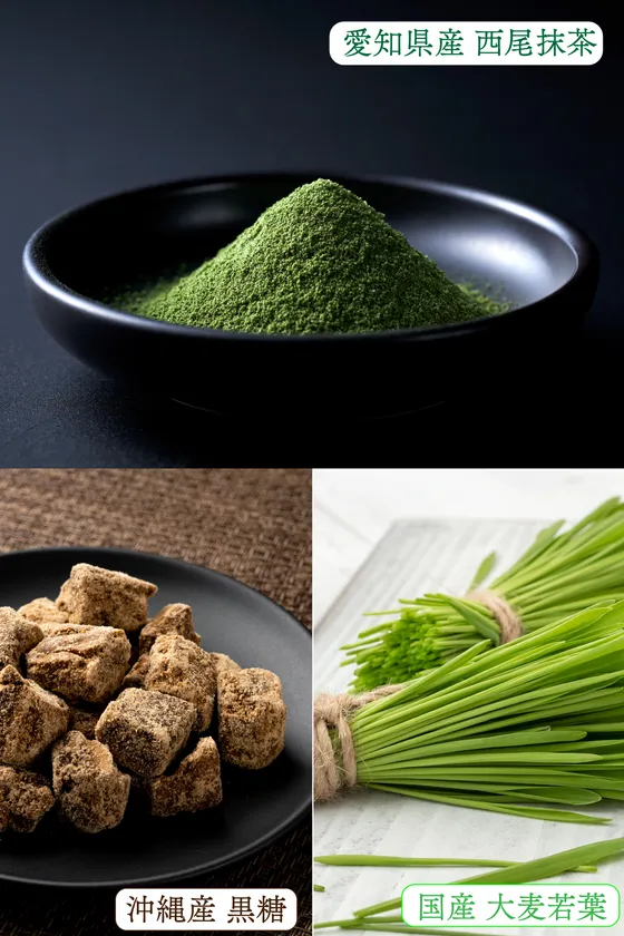 青汁の主原料に関してはさまざまな素材を試しましたが、栄養面そして飲みやすさの観点から厳選し国産大麦若葉を選びました。青汁の原材料としては今日よく耳にする素材ではありますが、西尾抹茶、黒糖、大麦若葉の3種で織りなす味には、まろやかな旨みと深いコクがあり、何とも言えないおいしさと飲みやすさがあります。