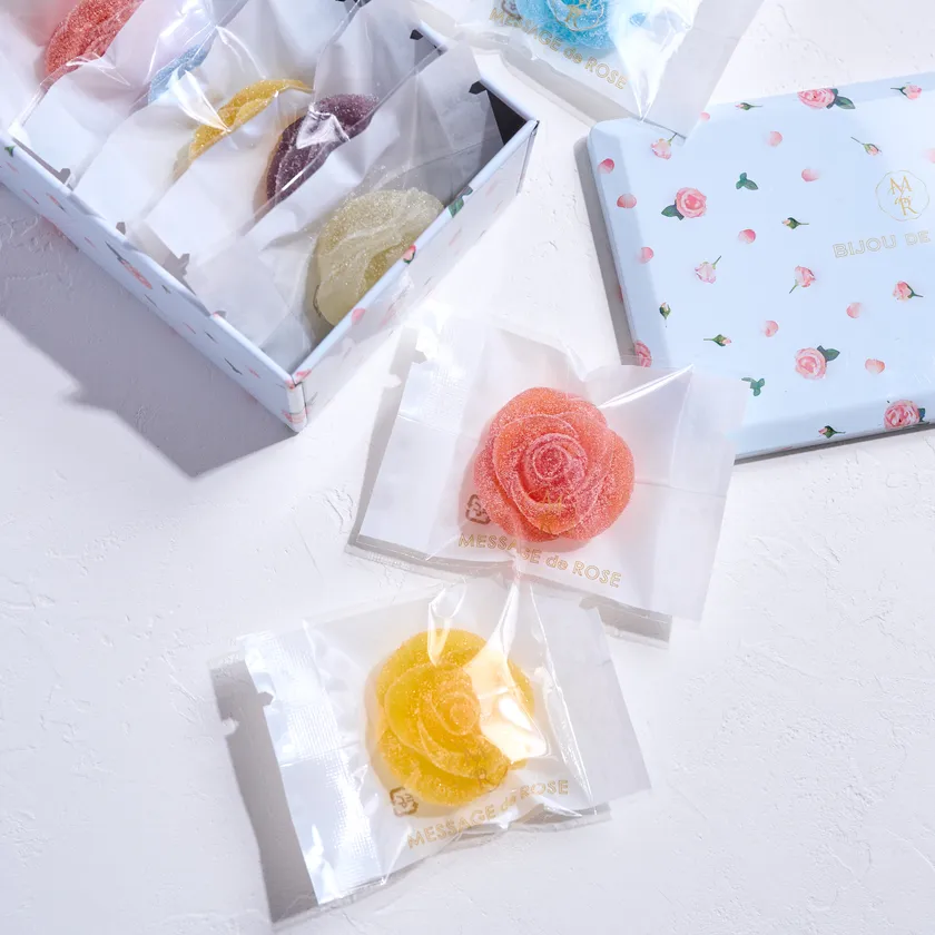 夏らしく爽やかなフレーバーはライチ、ブドウ、レモン、ソーダ、イチゴ、マンゴー、マスカットの7種類。宝石のようにキラキラと輝く薔薇のグミキャンディを限定の小花柄の缶に詰めました。