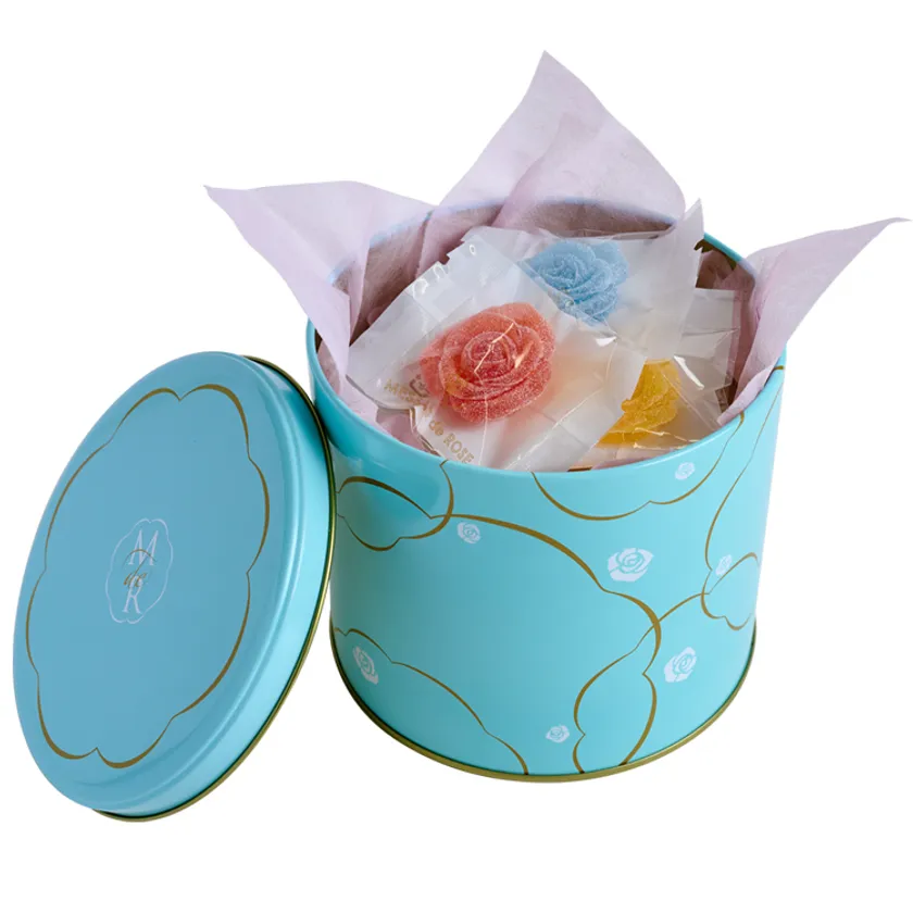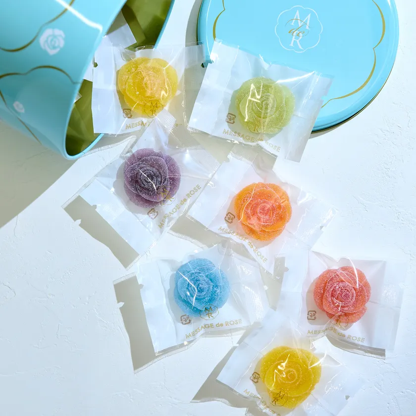 夏らしく爽やかなフレーバーはライチ、ブドウ、レモン、ソーダ、イチゴ、マンゴー、マスカットの7種類。宝石のようにキラキラと輝く薔薇のグミキャンディを限定の青いコフレ缶に詰めました。
