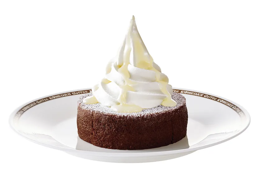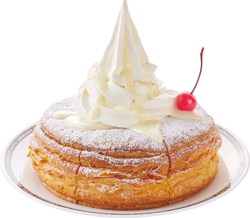ココアバウムクーヘンに粉砂糖、ソフトクリーム、さらに上から練乳をたっぷりとかけて仕上げました。スッキリとした甘さのソフトクリームとコク深いミルキーな練乳、ココアバウムクーヘンの3つの異なる甘さが絶妙なハーモニーを奏でます。お近くのコメダ珈琲店で甘いひとときをお過ごしください。