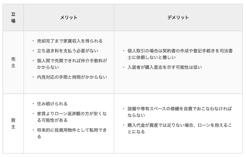 売主にとっては、売却活動期間中も家賃収入を得られるのがメリットです。投資用物件を探している買主にとっては、購入時点での空き室リスクがないことがメリットといえます。