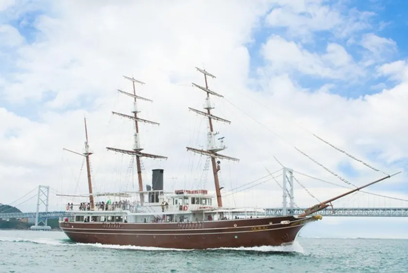 明石海峡大橋、淡路島西海岸を「咸臨丸」の大型帆船で体験するクルージングです。