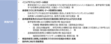 本イニシアチブでは、産学官等の連携の下、健康的で持続可能な食環境の実現に向けた社会実装エコシステムの構築と展開を図ります。主な実施内容(予定)は以下のとおりです。
