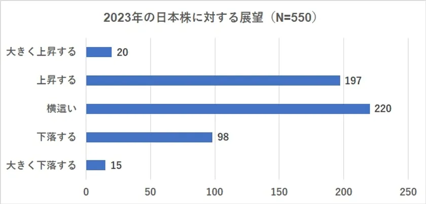 2023年の日本株に対する調査では、「上昇する」「大きく上昇する」と回答した人は217人で全体の39.5%だったのに対して、「下落する」「大きく下落する」と回答した人は113人で20.5%となりました。下落すると考える人よりも上昇すると考えている人の方が多いという結果になりました。