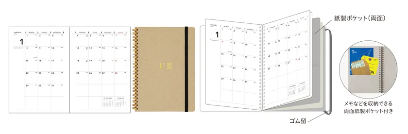 再生紙の表紙にブランドロゴの箔押し加工を施しています。メモなどの収納に便利な両面紙製ポケット付き。