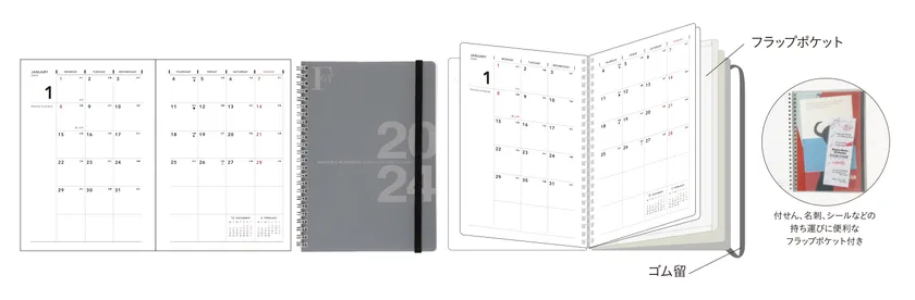 テレワークなどの移動に携帯しても角ヨレしにくい透明PP仕様の表紙。手帳まわりの小物の収納に便利なフラップポケット付き。