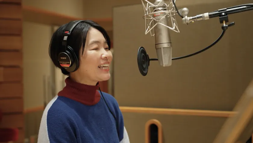 「今回はしんみりと、やさしい歌い方で」という監督のオーダーに「いつもは感情を顔でお伝えしている部分が大きいので、声だけで表現するのがとても難しいです」と不安げな様子をのぞかせていたイモトさん。