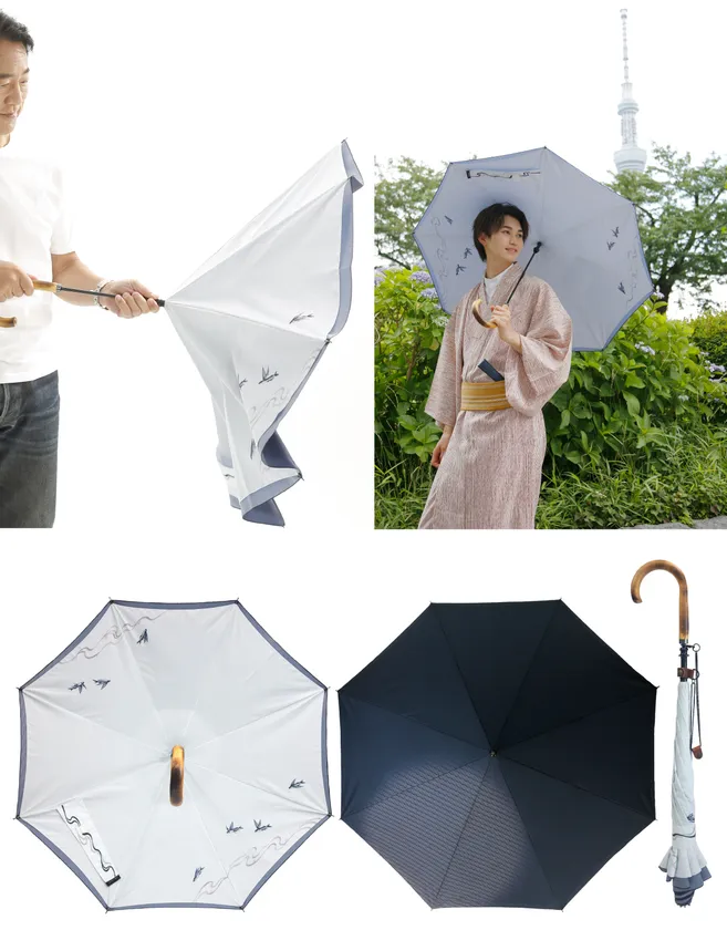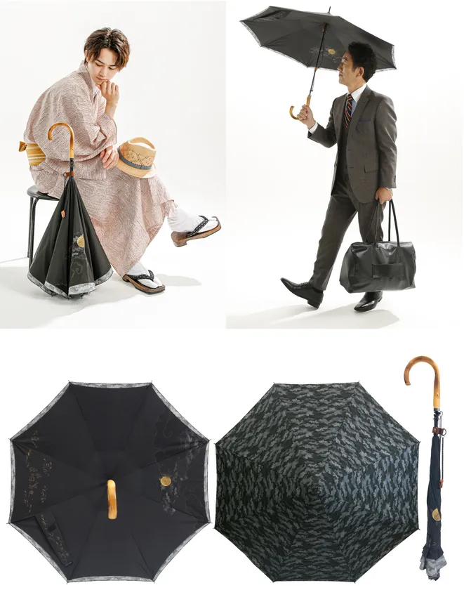 本商品は、ビジネスシーンでもカジュアルにも使え、洋装にも和装にも、どの季節・天候にも調和する紳士傘として開発されました。紳士物傘には少ない柄物の傘に、あえて和柄を選ぶことで高級感を演出し、「必要だから使うのではなく、お洒落だから使いたくなる」傘になることで、日傘男子への普及・インバウンド客への販売を目指しております。