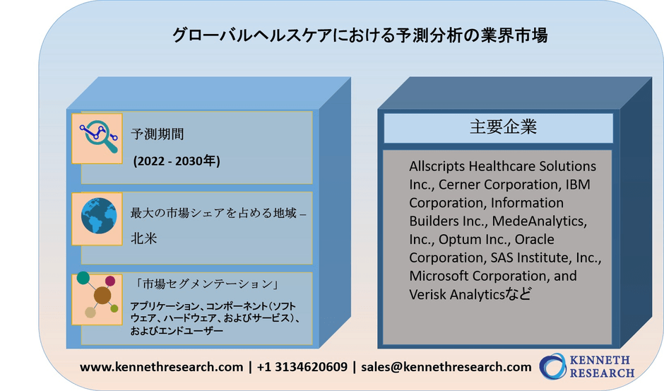 リサーチ・ネスターの一部門であるケネス・リサーチは、2022年2月28日に「世界のヘルスケア予測分析市場:世界需要分析と機会見通し2030」と題する調査レポートを発表しました。詳細な市場業界の需要分析と、市場の成長に影響を与えるさまざまな要因を提供します。このレポートは、予測期間、市場価値、市場規模、成長率、セグメント、市場プレーヤー、成長ドライバーなど、市場の成長を提供します。調査方法には、市場評価と予測データ計算に基づいて過去および現在のデータを収集することが含まれます。このレポートのデータ収集には、一次調査と二次調査の両方が含まれます。