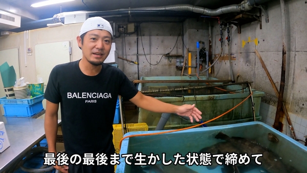 うっすら空が白む早朝に與座が向かったのは下関市唐戸市場。取引先の海産業者さんにお願いして、活かしの水槽から締めて冷やすまでの流れを今回特別に撮影させていただきました。