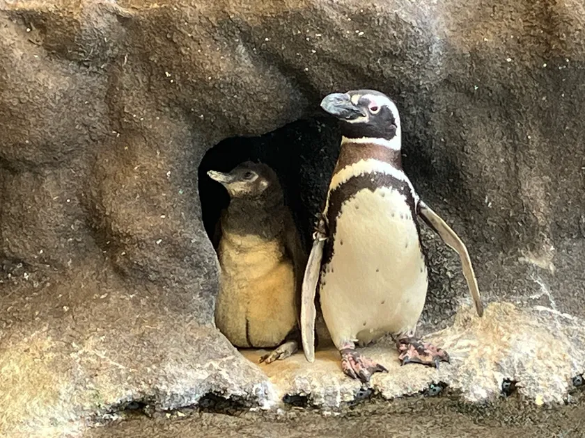 現在ヒナは、ペンギンランドの巣穴の中で過ごし、耳をよくすませると、中から「ピー」「ピー」と餌をねだる元気な鳴き声が聞こえます。