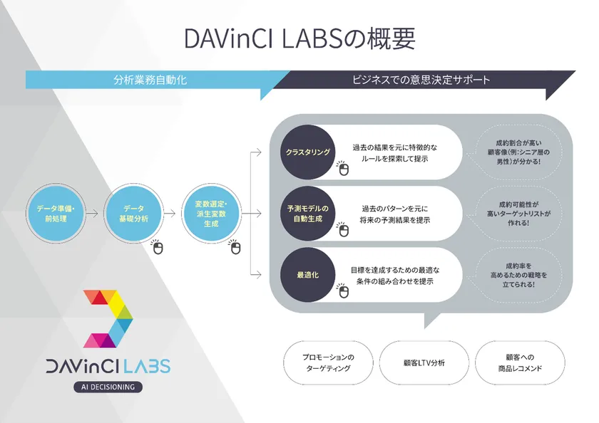 ダヴィンチ・ラボはAIに関する専門知見のないビジネス担当者でも簡単に操作できるユーザー・インターフェースを通じ、機械学習をもとにした予測モデル構築に加え、データの傾向性が分かるクラスター分析や、最適なアプローチ方法を探索する最適化等、データを通じてビジネスに役立つ多様なインサイトを得ることが可能となっています。