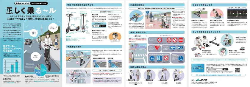 JA共済連(全国共済農業協同組合連合会・代表理事理事長 柳井 二三夫)では、令和5年7月1日に新しい車両区分である特定小型原動機付自転車が創設され、改正道路交通法及び関連法に準拠※1した一部の電動キックボードが、16歳以上であれば免許不要で公道での走行が可能になることを受け、新しい交通ルールを伝えるためのオリジナルWEB動画とチラシ『電動キックボード(特定小型原動機付自転車)正しく乗る~ル』を制作し、JA共済地域貢献活動ホームページ「ちいきのきずな」内の特設WEBサイト(URL: https://social.ja-kyosai.or.jp/tokuteikogata/ )で公開しました。