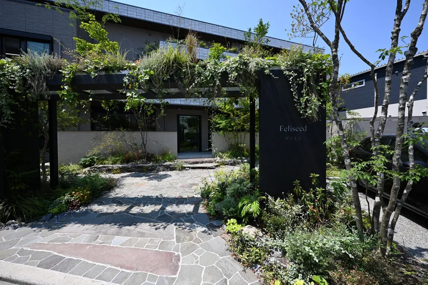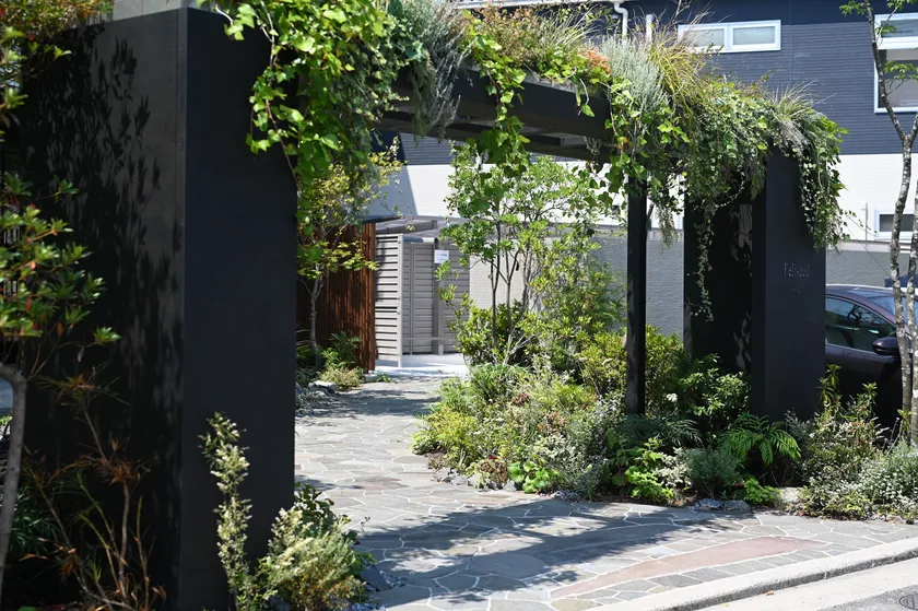 大きな特徴は、「ボタニカルゲート」。これまでのシャーメゾンは、地面に植栽するのが主流でしたが、今回は、普段使っていない2・3階のバルコニーの前や、通常は照明を設置する程度のエントランスゲート部分に緑を配置しました。「ゲートの上から緑を降り注がせたい。その緑のゲートをくぐって入居者の方々に入って欲しい。」そんな思いから、つる系のヘデラを中心に、ノシラン、シャリンバイなどを多用し、「ボタニカルゲート」が誕生しました。