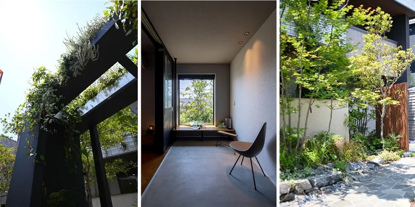 左/ゲートを下から望む 中央/室内から緑を楽しむ 右/石を目立たせるグランドカバーなどの植栽