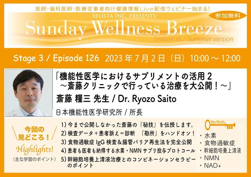 セリスタ株式会社(東京都千代田区、代表取締役:伊藤 承正)は、2023年7月2日(日)に、機能性医学の臨床における第一人者の斎藤 糧三先生(日本機能性医学研究所/所長)を講師に迎え、医師・歯科医師・薬剤師・医療従事者限定無料Zoomオンラインセミナー『機能性医学におけるサプリメントの活用2 ~斎藤クリニックで行っている治療を大公開!~』を開催します。