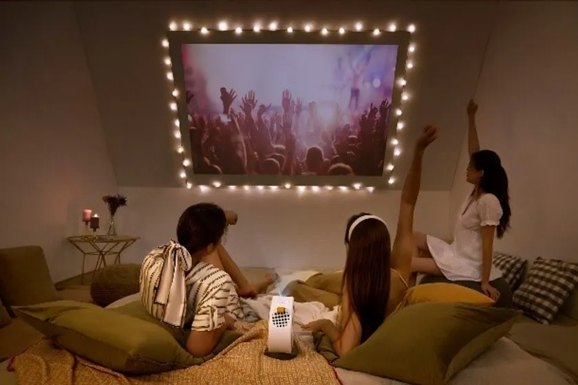 設置場所を選ばない最大135度の角度調整機能を備え、壁や天井はもちろん、斜め上にも自由自在に投影可能です。GV30ではオートフォーカスで瞬時にピント調整ができるほか、自動縦台形補正機能によりストレスフリーで動画視聴をお楽しみいただけます。さらに、専用キャリーケースも付属し、持ち運びも容易な製品となっているため、友人宅や旅行先でも場所を問わずリラックスできる空間を構築可能です。