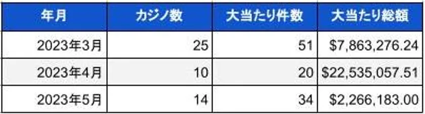 2023年5月は14店舗のカジノでジャックポット当選が34件出ており、当選総額は226万ドル(日本円で約3億2千万円以上)でした。