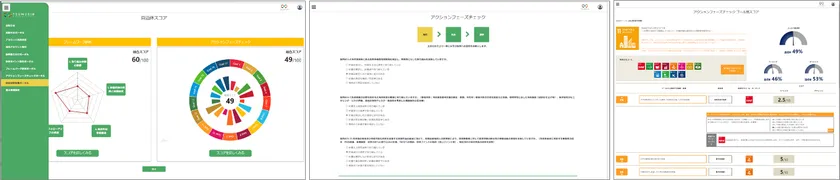 ツールの診断結果画面では、SDGsへの取り組み状況が分かりやすいチャートやスコアで可視化されるので、庁内、市民・事業者などへの情報発信、意識啓発等に活用が可能です。