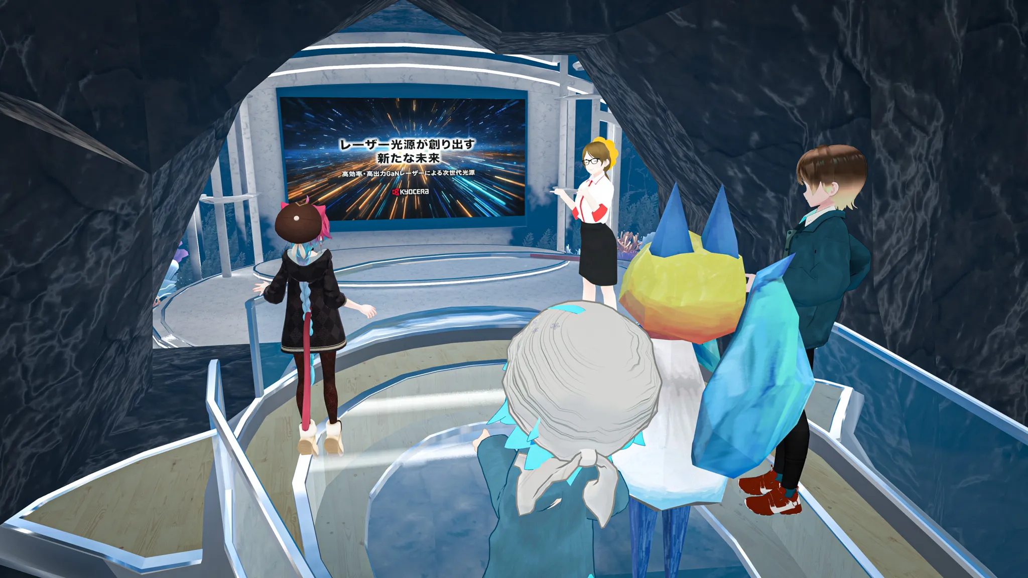 京セラのレーザー光源が創り出す新たな未来と称して、今後の実用化が期待される光無線通信搭載の水中ドローンが活躍する様子や、海中の発電施設のメンテナンスや海洋生物の観察などで活躍する水中ドローンをツアー形式でご案内します。ツアーの最後にはレーザー製品を紹介するプレゼンテーションがございます。