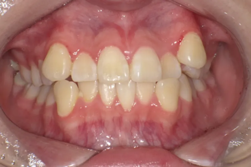 主訴は左上に八重歯がある。右側Angle ClassII 左側Angle Class I、FMA 36.6°、A.L.D.(凸凹の量/上顎 -10.0mm、下顎 -4.0mm)